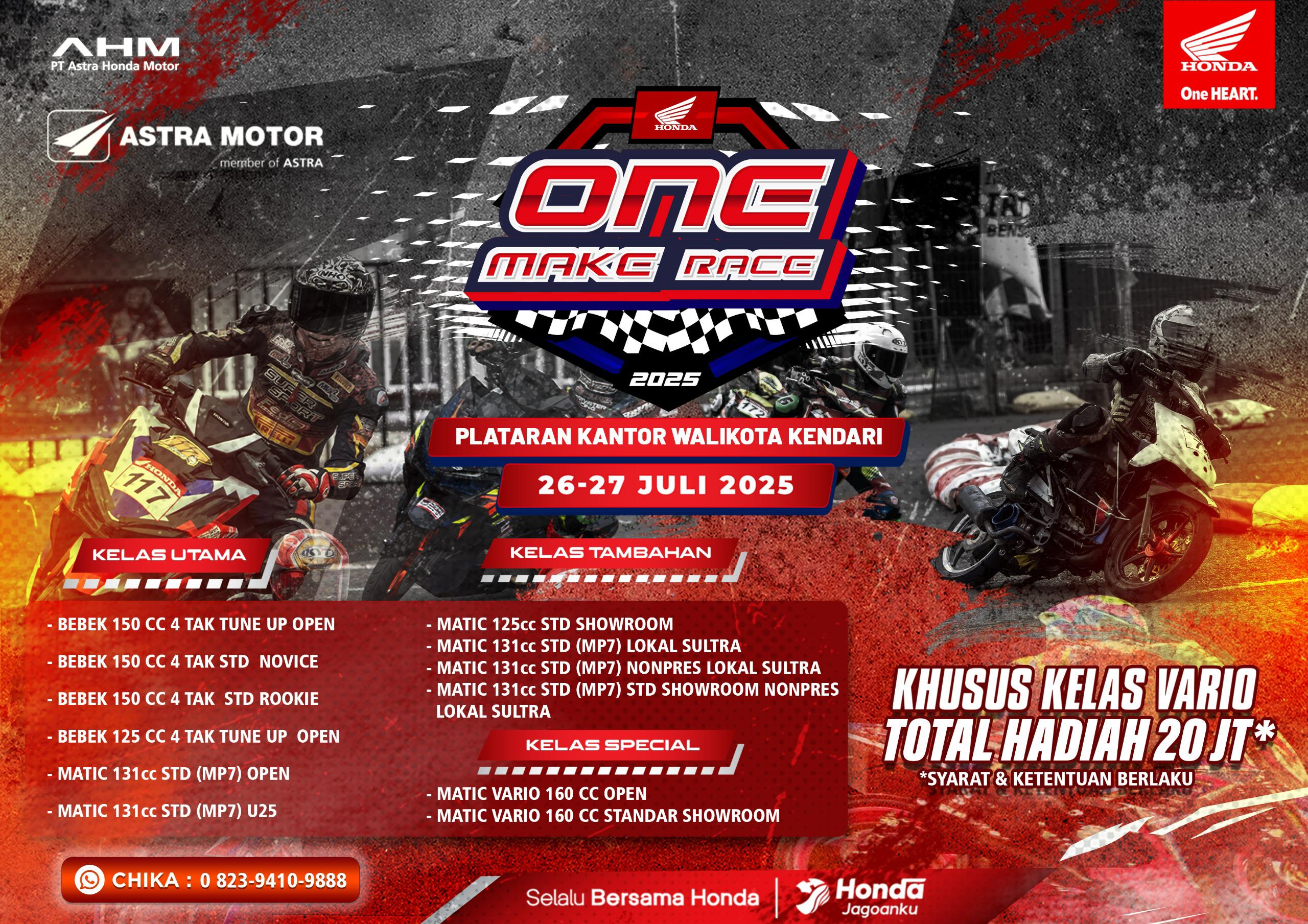 “Honda One Make Race bukan hanya sekadar ajang balap, tetapi juga sebagai wadah positif bagi masyarakat dan komunitas untuk menyalurkan bakat balapnya dengan cara yang aman dan sportif. Kami sangat mengapresiasi antusiasme para pecinta balap di Sulawesi Tenggara, dan tahun ini kami hadir dengan kelas spesial Vario yang total hadiahnya mencapai 20 juta,” ujar Erick.