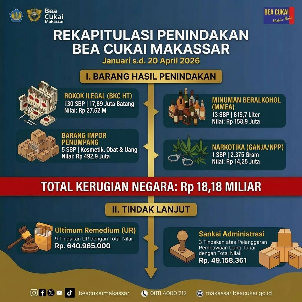 Terhadap berbagai pelanggaran di bidang cukai selama periode Januari s.d April 2026, Bea Cukai Makassar memperoleh penerimaan negara dengan diterbitkan 9 Ultimum Remedium (UR) dengan nilai sebanyak Rp640.965.000, dan terhadap pelanggaran pembawaan barang penumpang berupa uang tunai dari luar negeri, telah dikenakan 3 sanksi administrasi sebesar