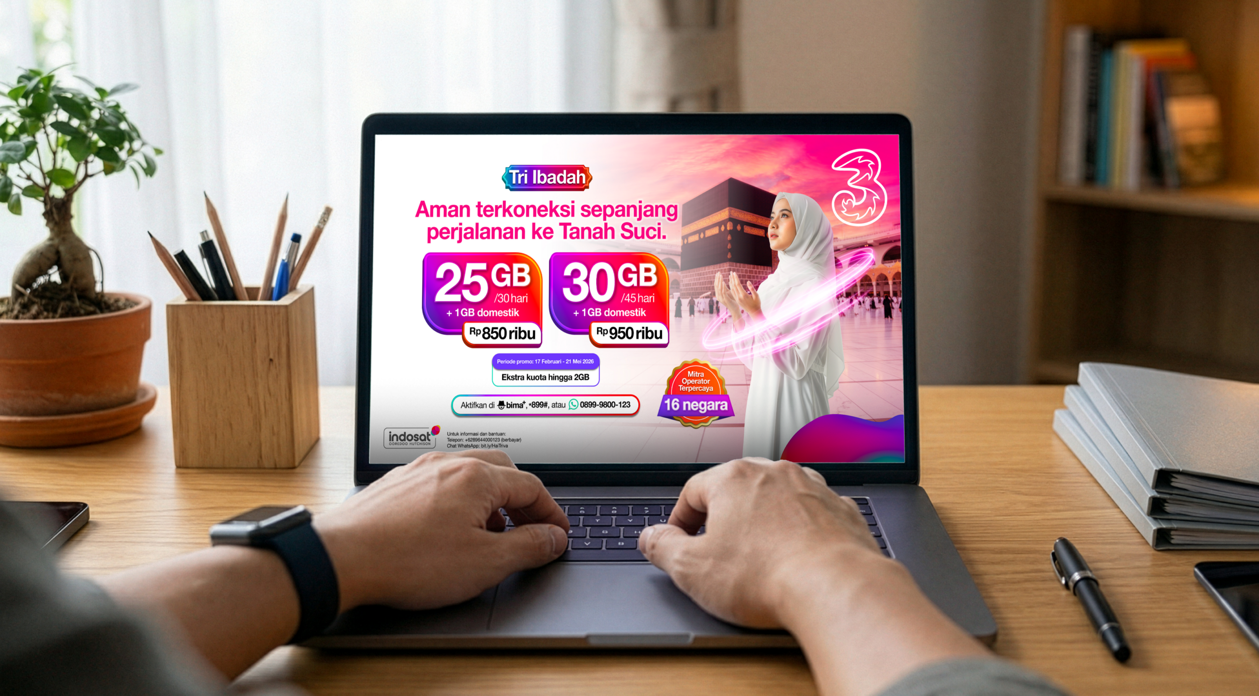 Dengan pilihan kuota yang fleksibel, masa aktif yang menyesuaikan perjalanan ibadah, serta perlindungan tambahan untuk komunikasi yang lebih aman dan nyaman, Tri Ibadah hadir untuk mendukung pengalaman ibadah yang lebih tenang, lebih lancar, dan lebih baik.