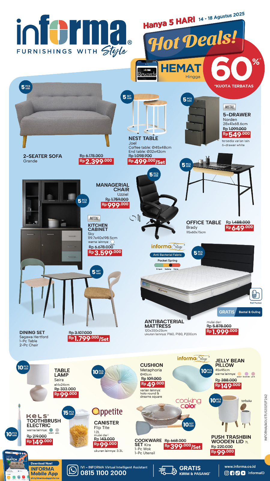 Tidak sekadar berjualan produk, Informa juga menyediakan layanan Clean and Care yang meliputi pembersihan AC, karpet, sofa, kasur, jok mobil, penghilang noda, hingga penyemprotan disinfektan. Selama promo ini, layanan tersebut hadir dengan harga lebih hemat, memberikan pelanggan kenyamanan dan kebersihan optimal.
