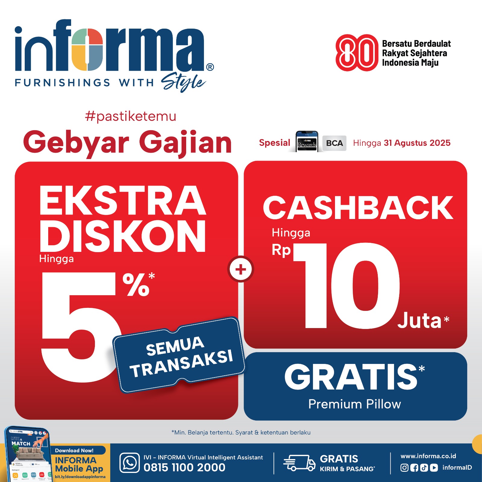 Bagi pencinta desain minimalis, Informa menyediakan koleksi furniture dan aksesoris stylish yang tetap fungsional, lengkap dengan keuntungan cashback hingga Rp10 juta yang berlaku sampai akhir Agustus. Dukungan kemudahan pembayaran juga ditawarkan melalui fasilitas cicilan 0 persen hingga 24 bulan bagi pengguna kartu kredit tertentu. Sementara itu, pelanggan tanpa kartu kredit dapat memanfaatkan cicilan ringan melalui DanaKini dengan bunga 0 persen untuk tenor tiga dan enam bulan khusus selama periode promo.