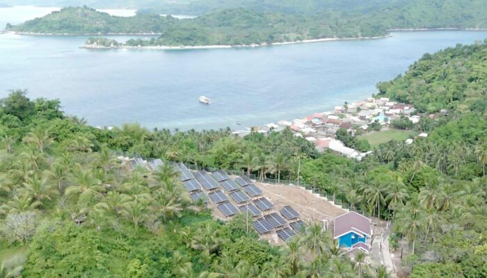 Foto udara Pembangkit Listrik Tenaga Surya (PLTS) Tanamalala dengan kapasitas 189,6 kilowatt peak (kWp) yang terletak di Kepulauan Selayar, Sulawesi Selatan. PLTS milik PLN tersebut mampu mengurangi emisi CO2 sebesar 415 ton/tahun dan menghasilkan energi hijau sebesar 197 Ribu killowatt hour (kWh)/tahun.