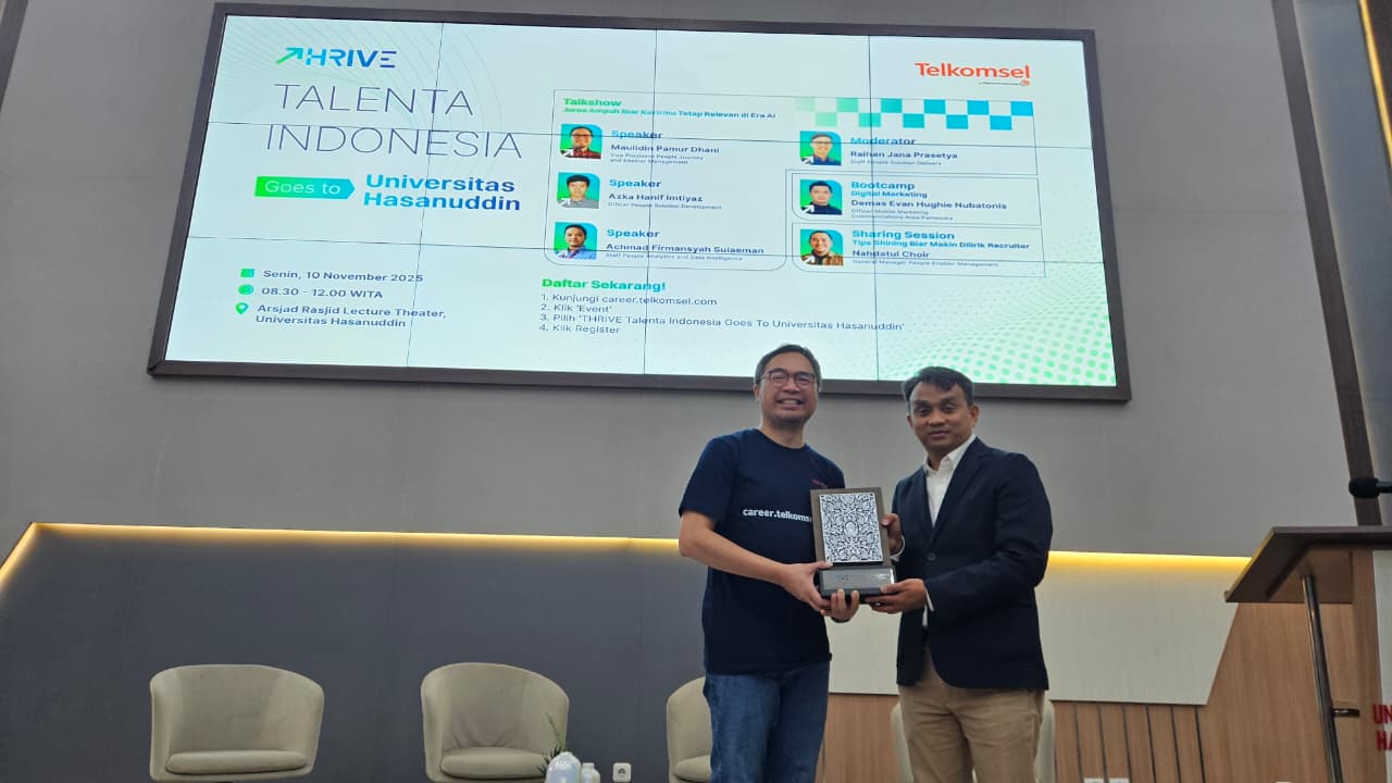 ELINE.NEWS,Makassar – Setelah sukses digelar di Telkom University, Universitas Diponegoro dan Universitas Gadjah Mada, THRIVE Talenta Digital Indonesia hadir di Universitas Hasanuddin (UNHAS), Senin 10 November 2025. Acara inspiratif dari Telkomsel ini, bertujuan untuk membekali mahasiswa dengan kapabilitas masa depan yang relevan di era digital dengan menghadirkan beberapa narasumber ahli dari Telkomsel. Materi yang dibawakan seputar pengembangan kapabilitas ditengah perkembangan teknologi digital seperti Artificial Inteligence (AI) dan Data Analytics.